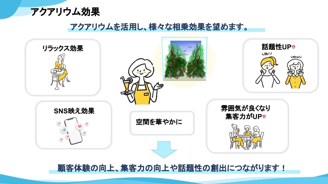 店舗はインテリアや癒し、コミュニケーションツールとしてアクアリウムを置くことで集客やリピートに繋げることができ、アクアリストは自己表現の機会となります。