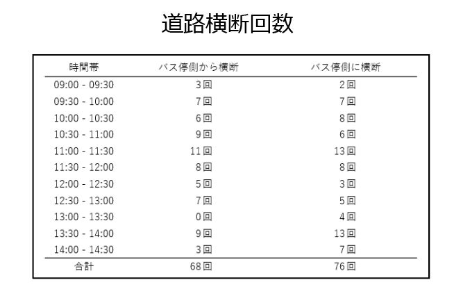 道路横断者計測対象:①15分毎の滞留人数(バス停看板付近を除く)/②バス停車時刻/③バス追い越し通行車両/④道路横断者