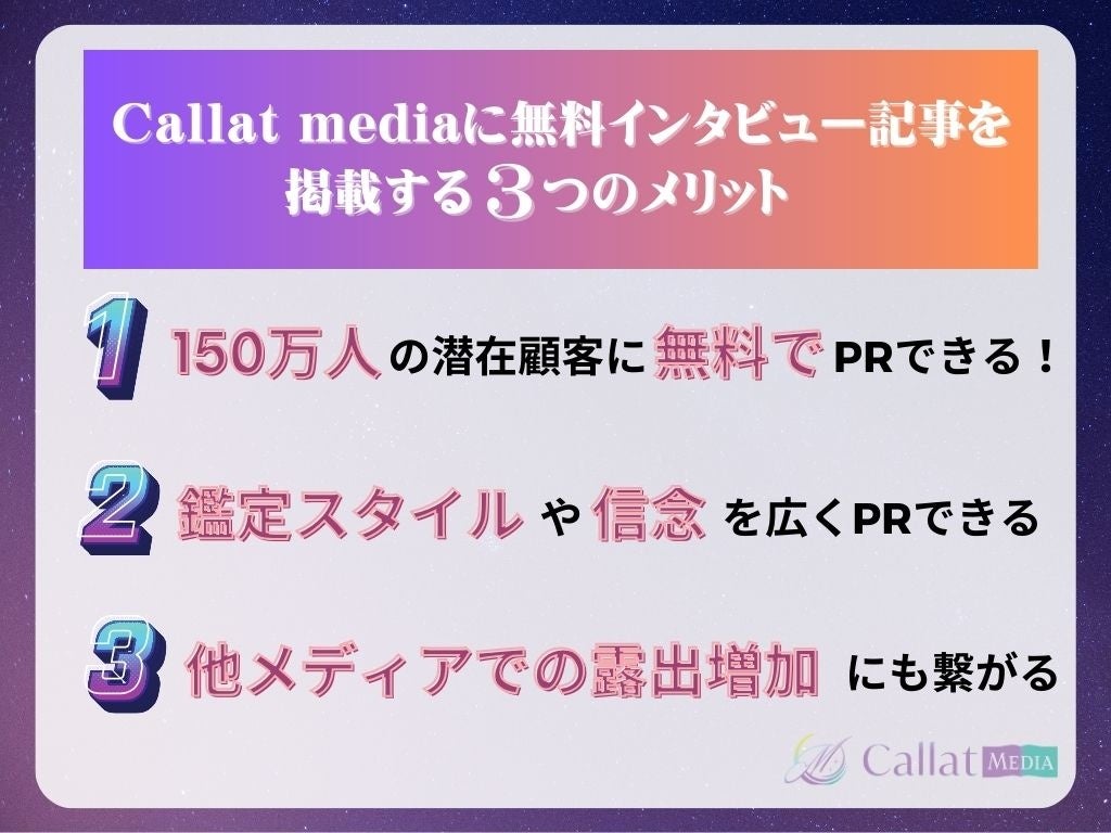 Callat mediaに無料インタビュー記事を掲載することで、150万人の潜在顧客に自分の強みや鑑定スタイル・信念といった魅力をアピールできます。
