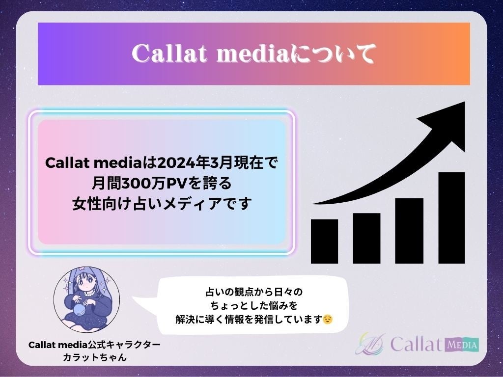 Callat mediaは2023年6月に運営を開始し、2024年3月現在で月間300万PV、150万UUを誇っております。占い・スピリチュアルにまつわる情報を広く発信しているため、実際に占いやセッションを日常的に利用しているユーザーも多く流入しています。