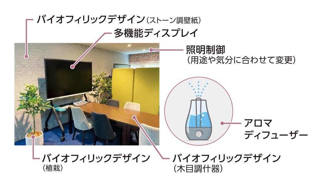 バイオフィリックデザイン*を取り入れた内装、什器による心理的なストレス低減