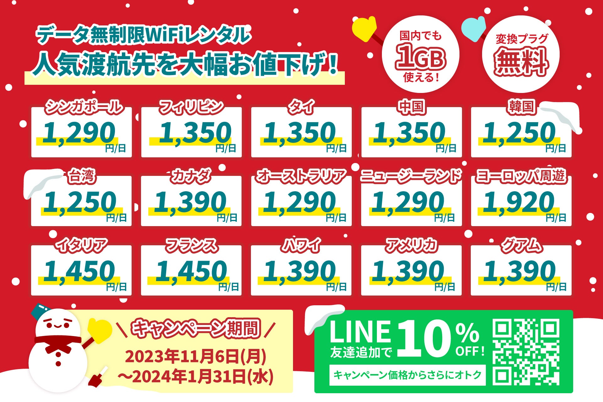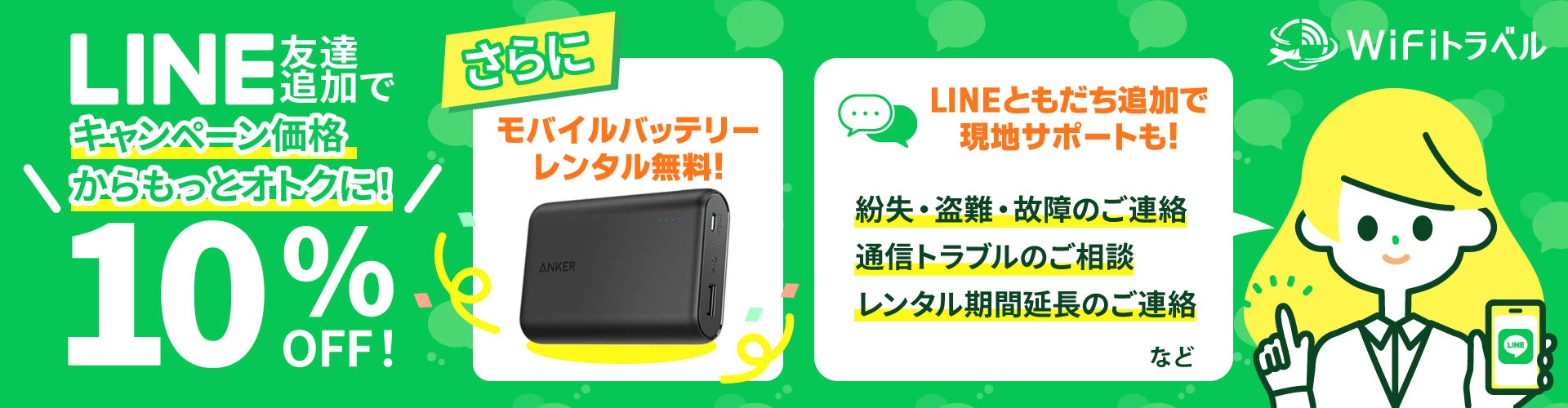 冬旅キャンペーンと並行して、LINEお友達登録をしていただくと特典としてキャンペーン割引価格からさらに10%OFFとなり、モバイルバッテリーもレンタル無料になります!