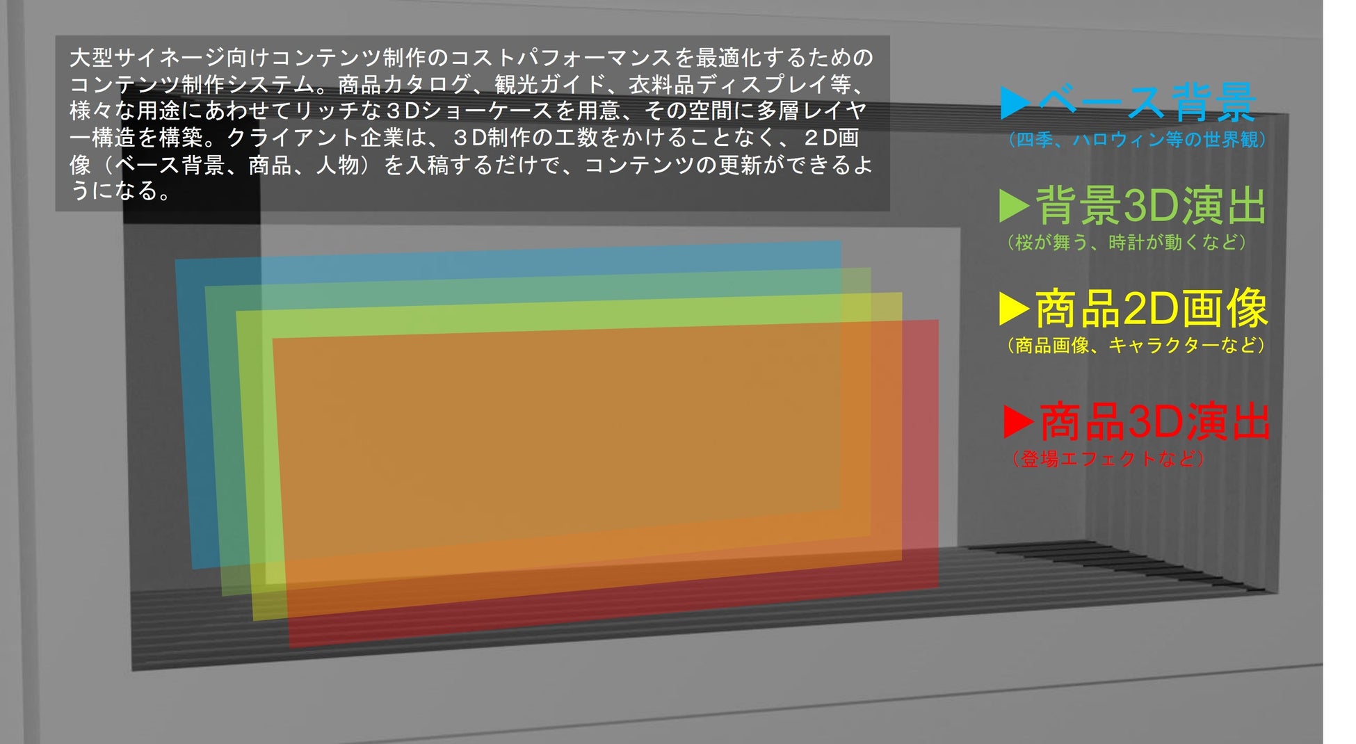 このシステムは、最大10個のレイヤーをそれぞれの奥行で配置することにより、立体的な切り絵のような表現を作り出すことができます。各レイヤーはイメージデータを入稿することでカスタマイズ可能であり、ベース背景、背景3D演出、商品2D画像、商品3D演出など、多層レイヤー構造を活用して、視覚的に魅力的なコンテンツを簡単に作成できます。
