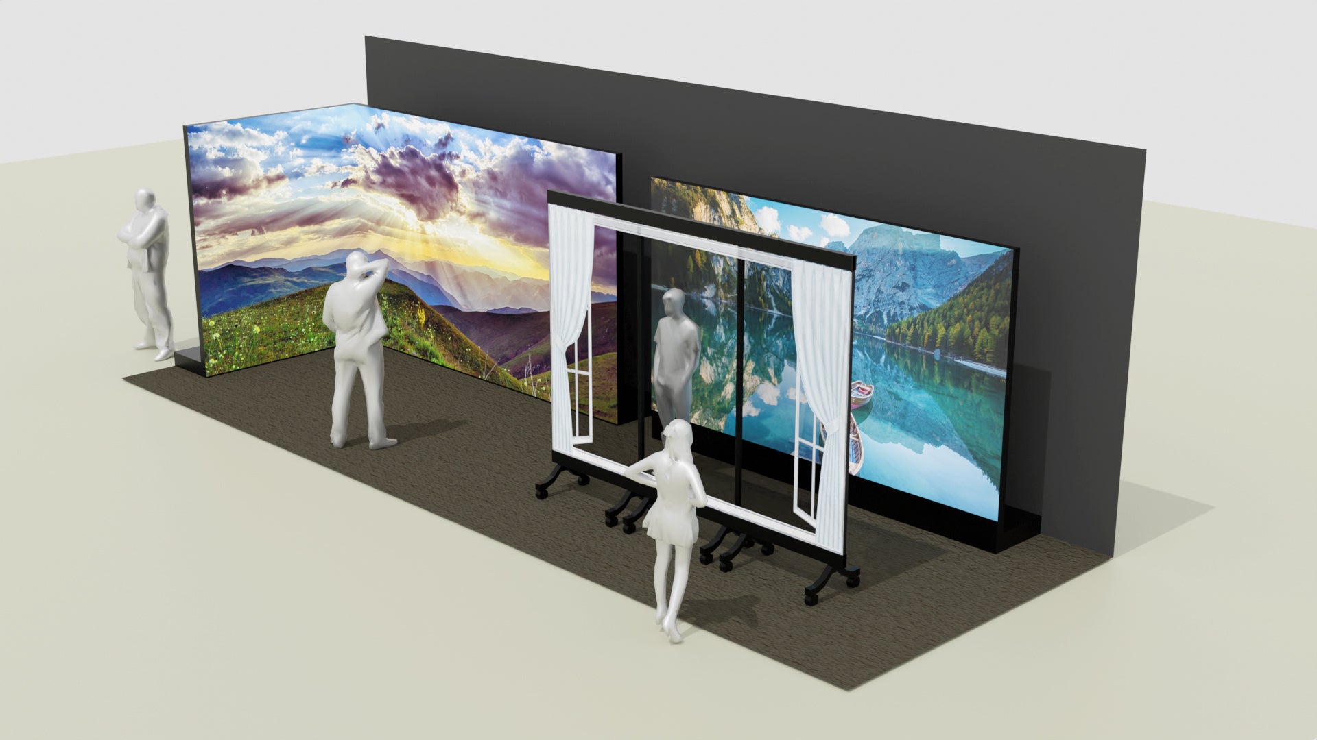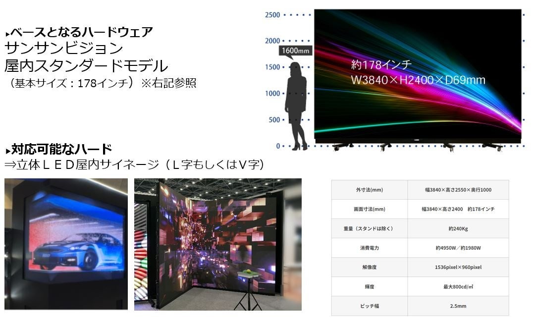 三幸電子製の「サンサンビジョン屋内スタンダードモデル」をベースとする今回のXRサイネージのメインパネルは、外寸法が幅3840×高さ2550×奥行1000mmで、画面寸法は幅3840×高さ2400mm、約178インチの大画面を誇ります。重量は約240Kg(スタンドは除く)で、消費電力は最大で約4950W、平均で約1980Wです。解像度は1536pixel×960pixelで、輝度は800cd/㎡、ピッチ幅は2.5mmとなっており、鮮明な映像を大画面で提供することが可能です。