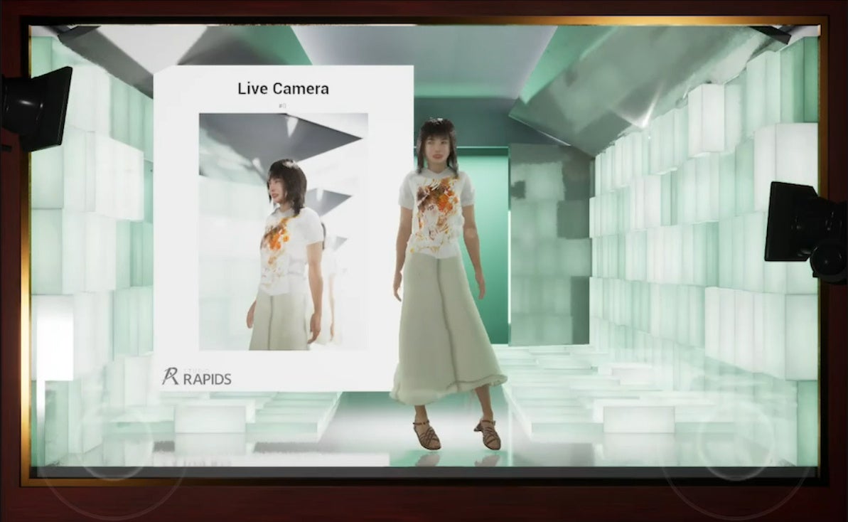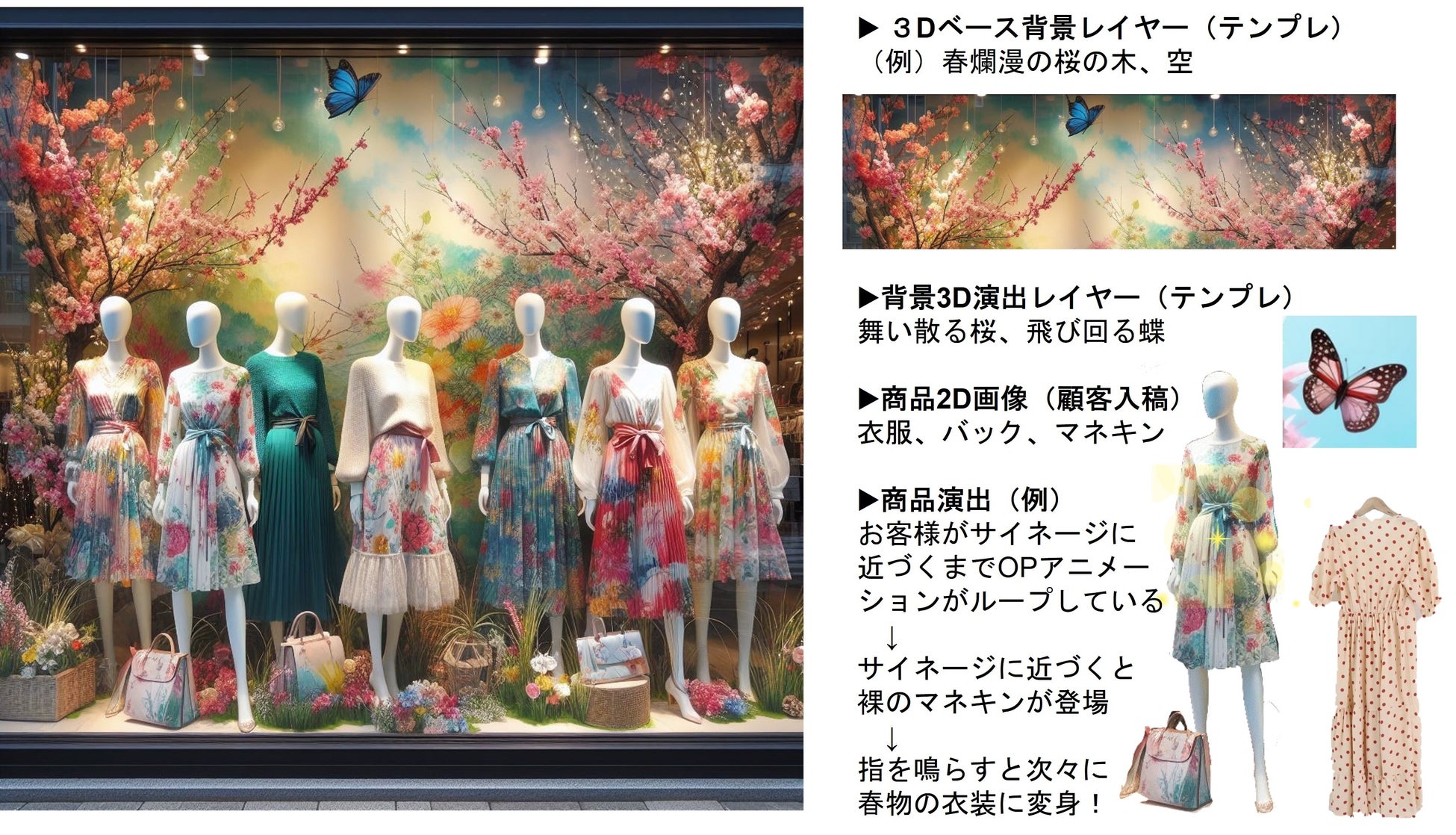 例えば、季節ごとに変わるアパレル店舗内の3Dディスプレイでは、桜並木の背景に春物を身にまとったマネキンを配置し、桜が舞い散るエフェクトを加えることで、訪れる人々に春の訪れを感じさせることができます。このように、本コンテンツ制作システムは、クライアント企業が3D制作の工数をかけることなく、2D画像を入稿するだけで、季節やイベントに合わせたコンテンツの更新を行うことが可能です。
