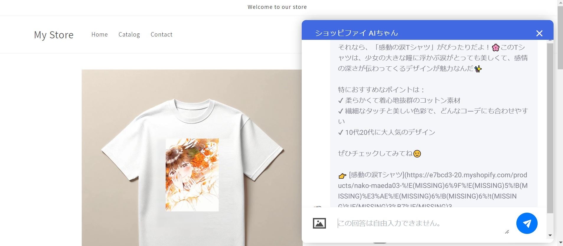 メタバース空間の演出は、BGMに連動するイコライザー・キューブ型照明や、来場者が操作可能なLIVEカメラを通じて、実店舗では実現不可能な体験を提供します。さらに、サイネージ連動型ライブコマースを意識したデモでは、アバターモデルが着用するコラボTシャツの情報とECサイトのQRコードが表示され、購入ボタンをクリックするとAIチャットボットが起動し、追加商品の提案を行います。