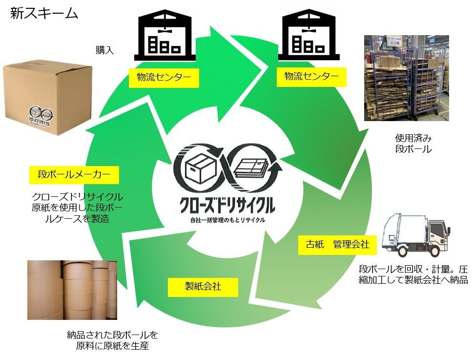 当社物流センター内の使用済み段ボールを再商品化し、安定的な段ボール古紙資源の循環スキームを構築