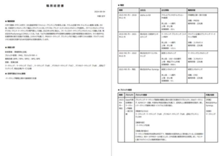 職務経歴書を提出する際、PDF(デザイン or シンプル)とExclelの形式にて出力可能にしました。提案先の要望や自身の好みに応じてご選択いただけます。