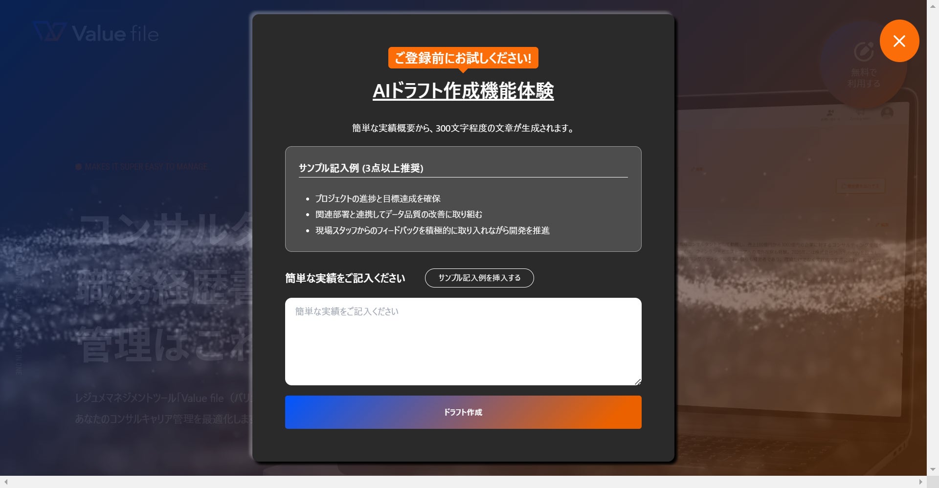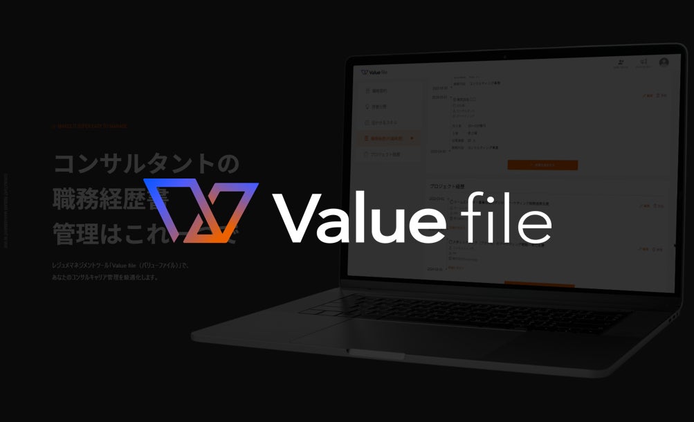 「コンサルタントの職務経歴書管理はこれ一つで」レジュメマネジメントツール「Value file(バリューファイル)」で、あなたのコンサルキャリア管理を最適化します。