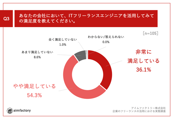 「Q3.あなたの会社において、ITフリーランスエンジニアを活用してみての満足度を教えてください。」(n=105)と質問したところ、「非常に満足している」が36.1%、「やや満足している」が54.3%という回答となりました。