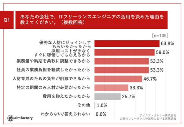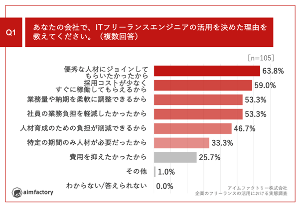 「Q1.あなたの会社で、ITフリーランスエンジニアの活用を決めた理由を教えてください。(複数回答)」(n=105)と質問したところ、「優秀な人材にジョインしてもらいたかったから」が63.8%、「採用コストが少なくすぐに稼働してもらえるから」が59.0%、「業務量や納期を柔軟に調整できるから」が53.3%という回答となりました。