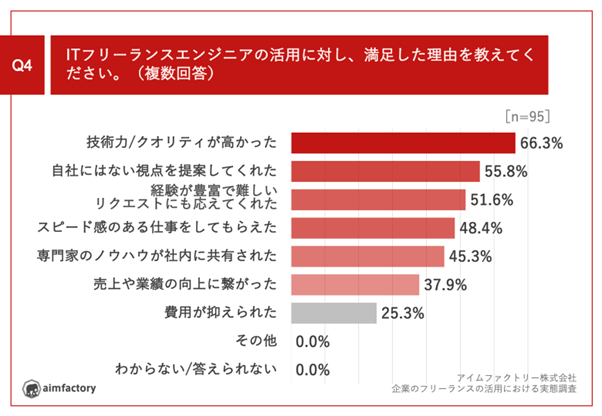 Q3で「非常に満足している」「やや満足している」と回答した方に、「Q4.ITフリーランスエンジニアの活用に対し、満足した理由を教えてください。(複数回答)」(n=95)と質問したところ、「技術力/クオリティが高かった」が66.3%、「自社にはない視点を提案してくれた」が55.8%、「経験が豊富で難しいリクエストにも応えてくれた」が51.6%という回答となりました。