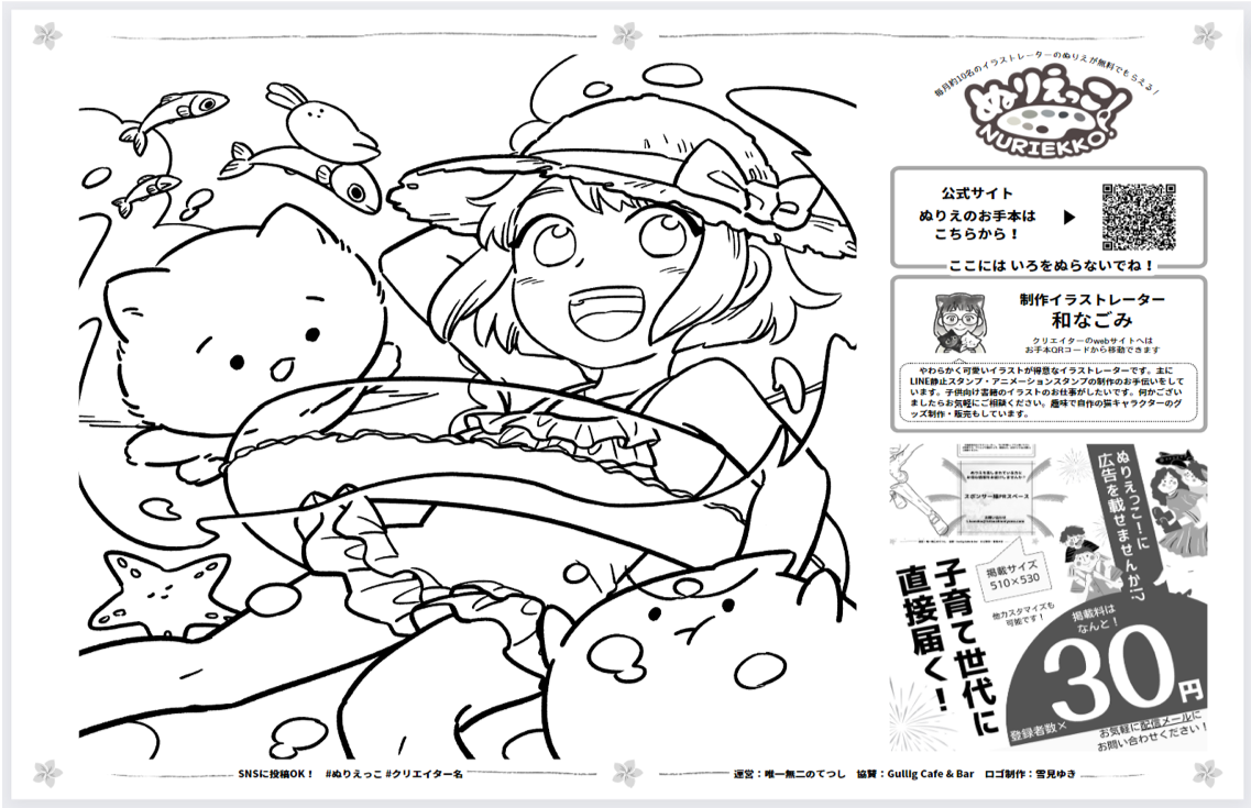 今回は毎月無料でクリエイターによるハイクオリティなぬりえをメールマガジン形式で企業・個人様にお送りする「ぬりえっこ!」のPR代理店としてアフターフォローも行っていきます。このサービスの魅力が一人でも多くの人に伝わればと切に思っています。