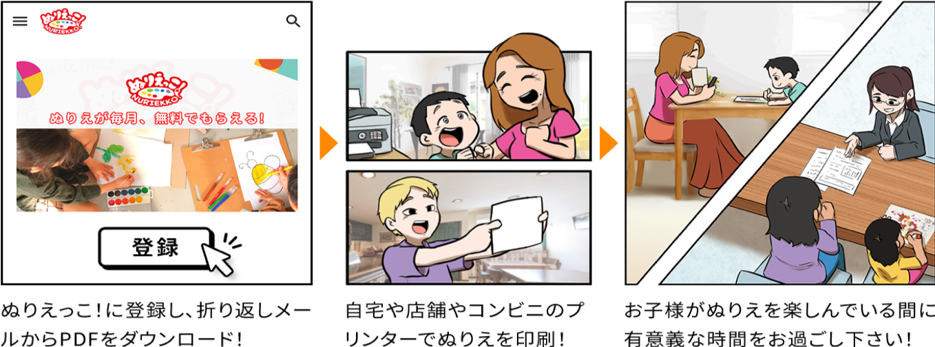 「ぬりえっこ!」は、個人・企業問わず誰でも毎月無料で10名のイラストレーターが制作したオリジナルぬりえをPDFデータで受け取る事ができます。受け取ったぬりえはご自宅や企業やコンビニのプリンターで印刷することで、何度でもぬりえを遊んでいただけます。