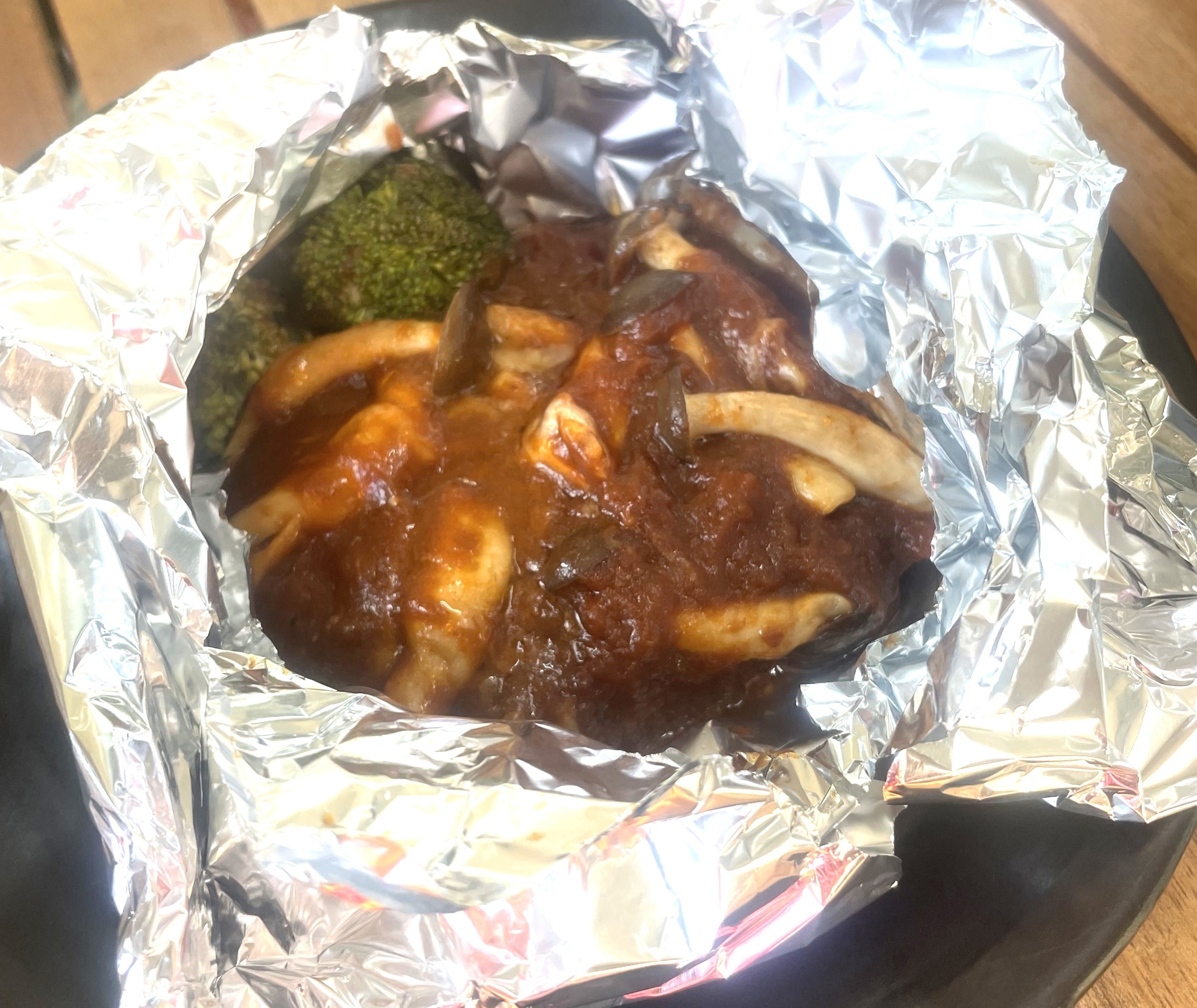 1. アルミホイルにハンバーグ、 ぶなしめじ、デミグラスソース、チーズ、冷凍野菜を入れてしっかり包む。