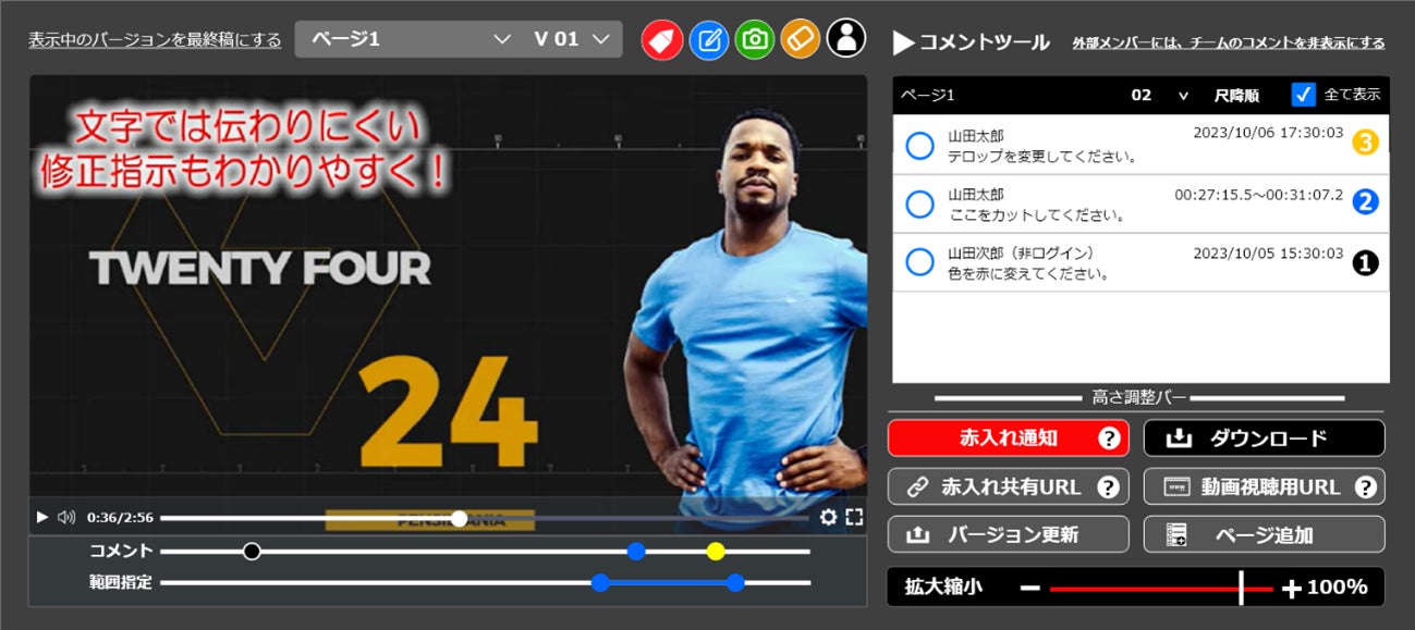WEBブラウザ上で動画、YouTube、ウェブデザイン、イラスト、写真、広告物、書類などの制作物を閲覧し、 そのままメディアに対して校正コメントやフィードバックが可能な校正ツールです。