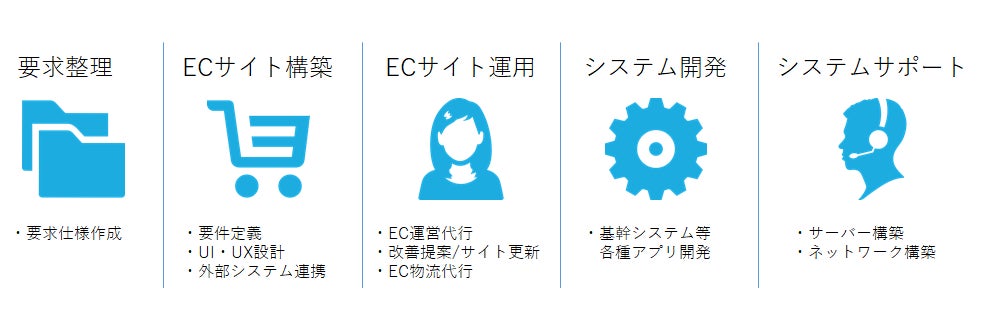 ・ECサイトの構築と導入支援サービス ・要求仕様作成支援サービス ・システム選定支援サービス ・システム導入支援サービス ・システムの受託開発 ・システムの運用保守サービス ・サーバ、PC及びネットワーク機器の販売 ・クラウド環境構築 |