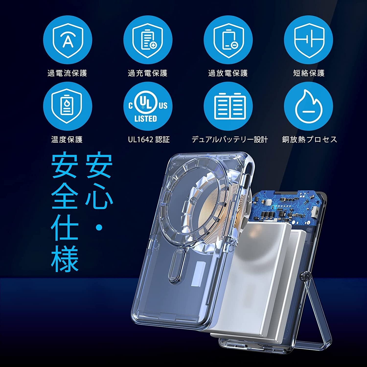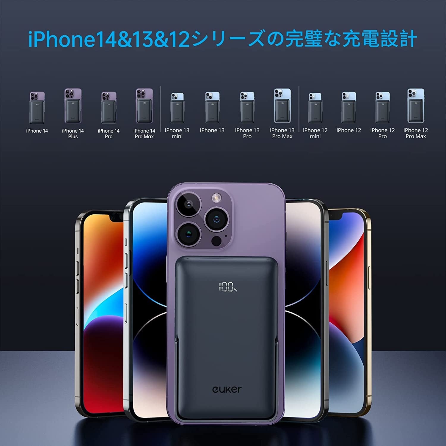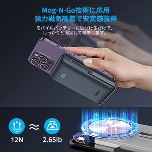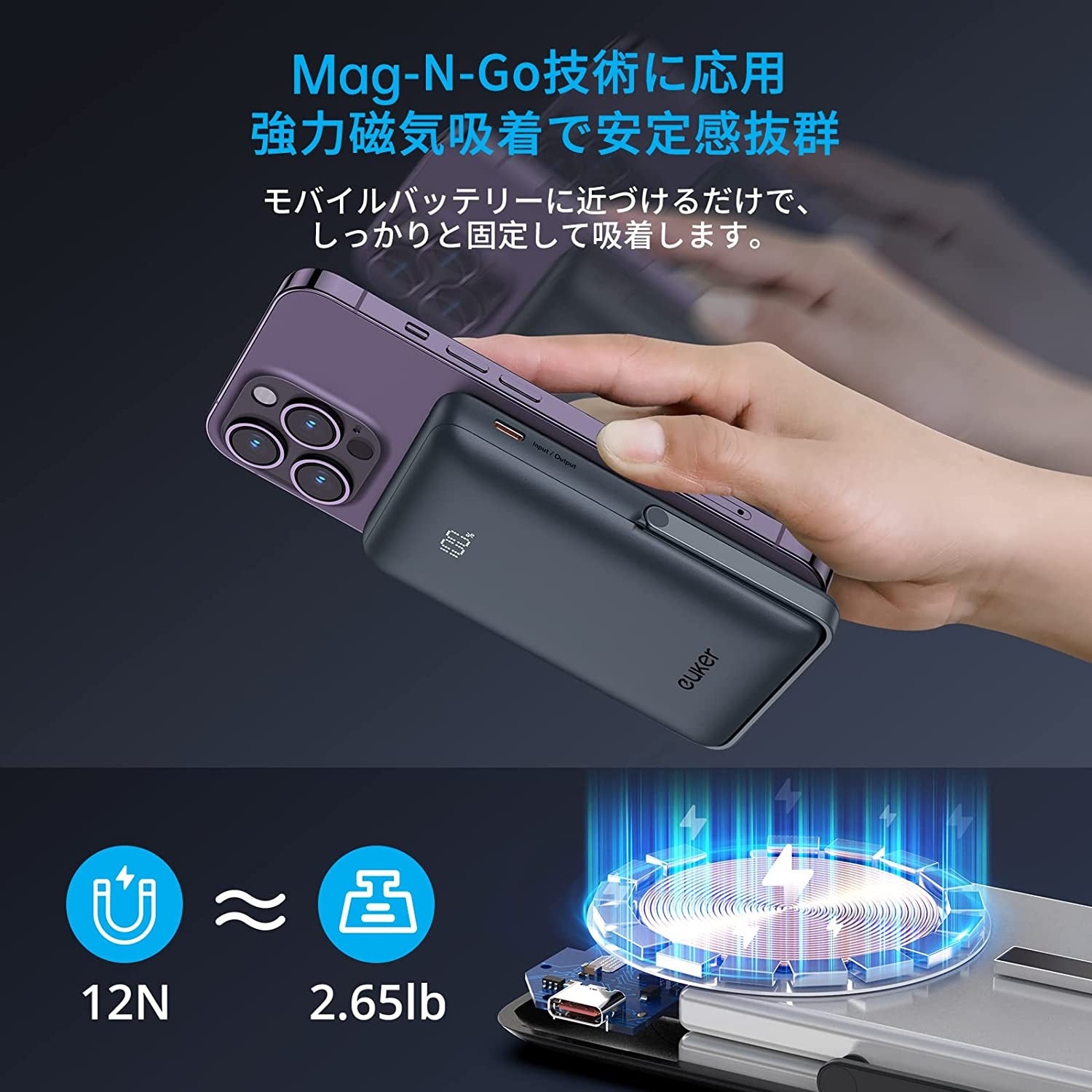 もう充電の心配から解放されませんか?Euker Magsafeモバイルバッテリーは、10000mAhの大容量とコンパクトで軽量なデザインを兼ね備え、いつでもどこでも充電の手間をなくします。独自のMagGo技術を搭載した当製品は、強力なマグネットで確実にデバイスに吸着し、最大15Wの高速ワイヤレス充電を実現します。そして折りたたみ式スタンドが内蔵されているため、視聴や会議時でも安定した角度でデバイスを保持し続けます。さらに、PSE認証済みで安全性も確保されています。まさに旅行や出張、災害時など、どんなシーンでもあなたの強力なパートナーになります。一つ持っていれば、デジタルライフがより自由で快適になること間違いなし!