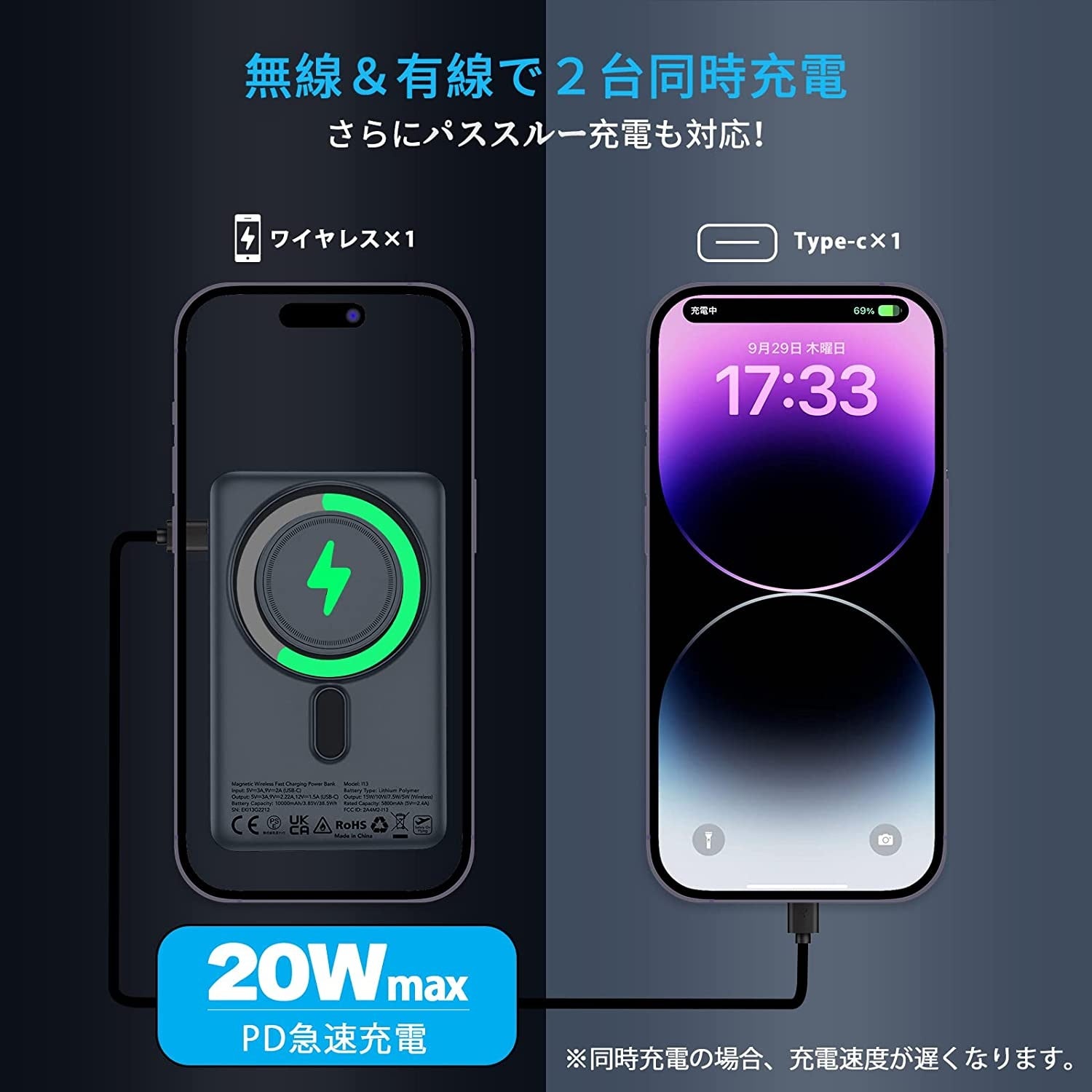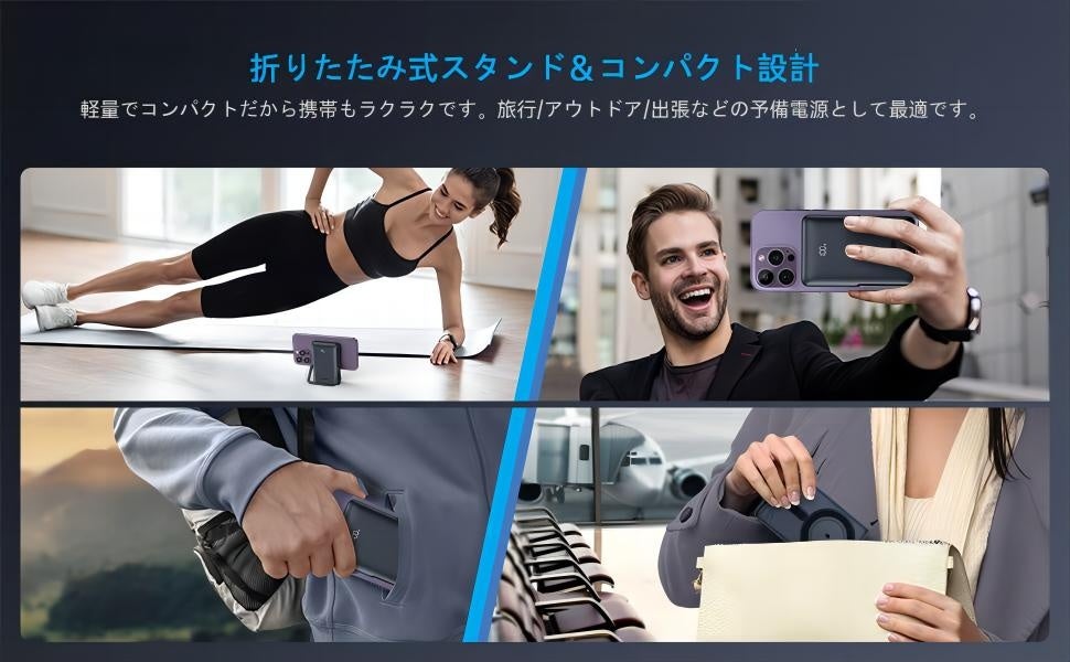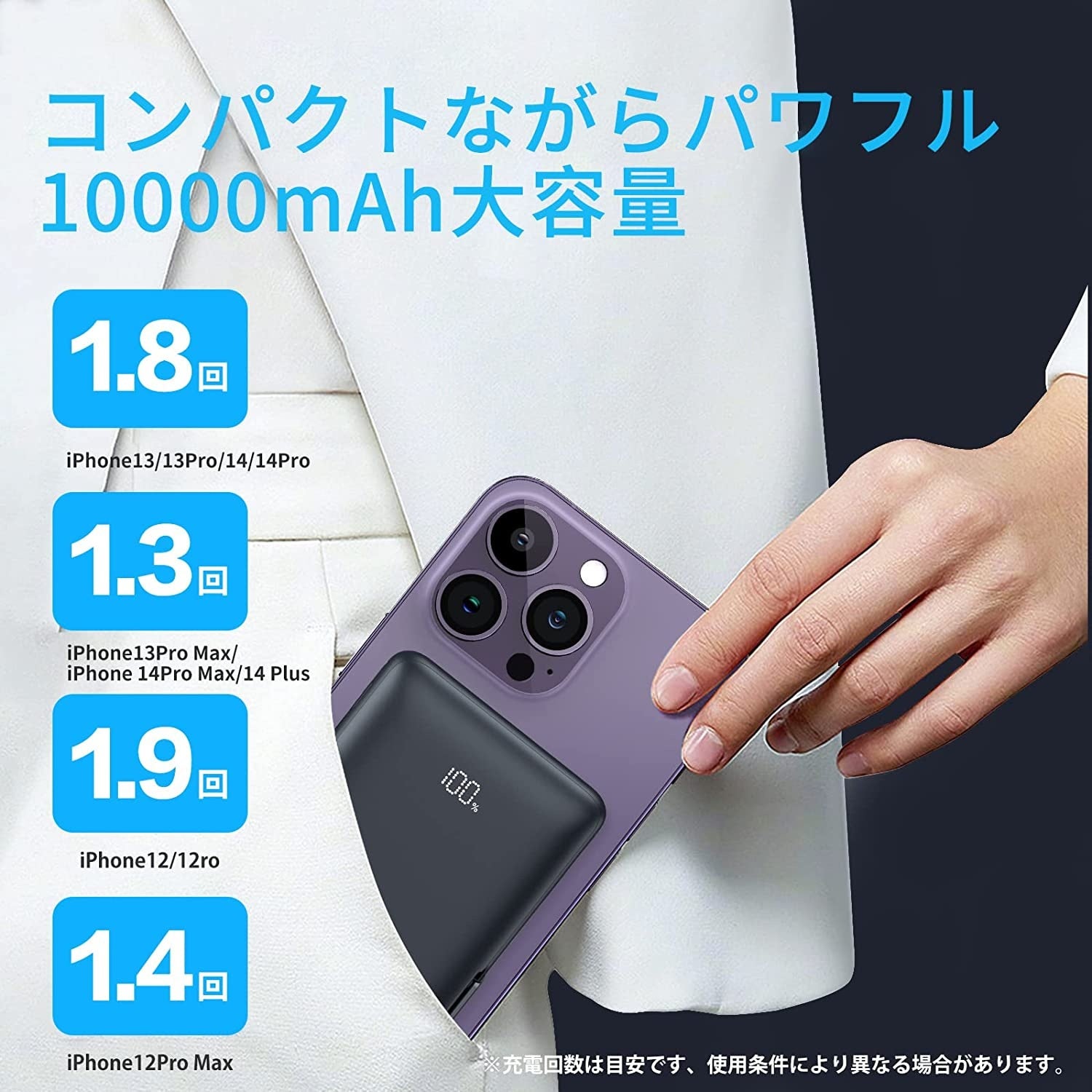もう充電の心配から解放されませんか?Euker Magsafeモバイルバッテリーは、10000mAhの大容量とコンパクトで軽量なデザインを兼ね備え、いつでもどこでも充電の手間をなくします。独自のMagGo技術を搭載した当製品は、強力なマグネットで確実にデバイスに吸着し、最大15Wの高速ワイヤレス充電を実現します。そして折りたたみ式スタンドが内蔵されているため、視聴や会議時でも安定した角度でデバイスを保持し続けます。さらに、PSE認証済みで安全性も確保されています。まさに旅行や出張、災害時など、どんなシーンでもあなたの強力なパートナーになります。一つ持っていれば、デジタルライフがより自由で快適になること間違いなし!