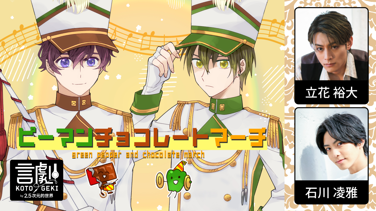 ”チョコレート”役はミュージカル『刀剣乱舞』、迷宮歌劇『美少年探偵団』、DMM TVオリジナル企画『ナナシ-第七特別死因処理課-』などに出演する立花裕大、“ピーマン”役はミュージカル『刀剣乱舞』、舞台『炎炎ノ消防隊 -地下からの奪還-』、DMM TVオリジナル企画『全惑星★激あまやかしバラエティ「箱入りミュータント」』などに出演する石川凌雅です。