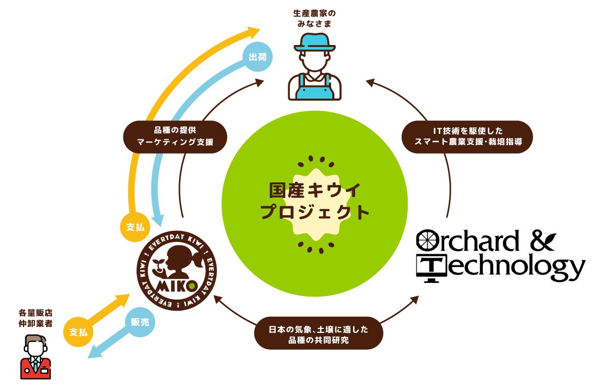 本プロジェクトは、国産キウイ品種を提供・販売するMIKO JAPAN、品種の共同開発及び栽培指導を行うOrchard & Technology株式会社、国産キウイ品種を栽培する生産農家の3者共同で 行っています。