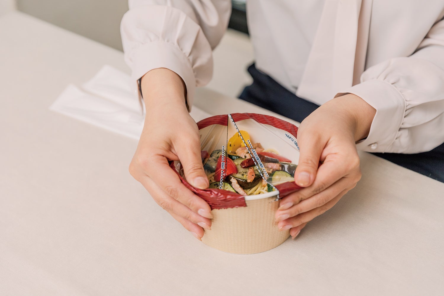 プラスチック製のフタがフィルムになるので、これまでと比べて約1/3のプラスチック削減につながります。