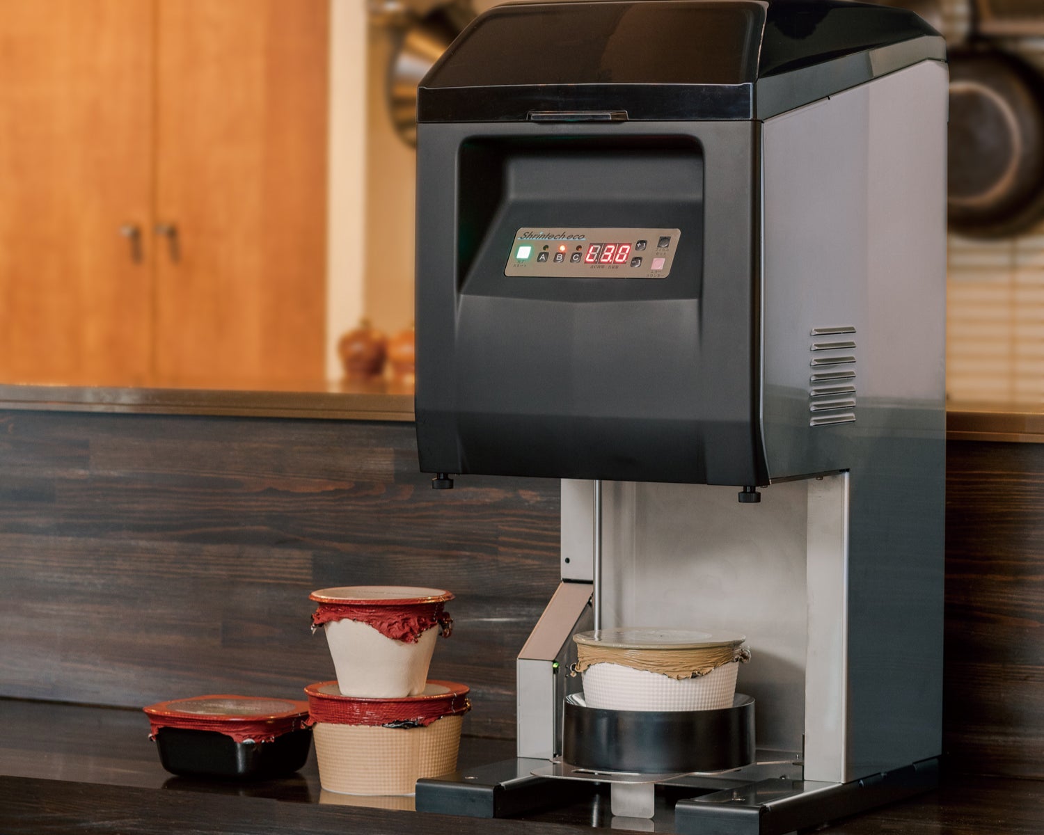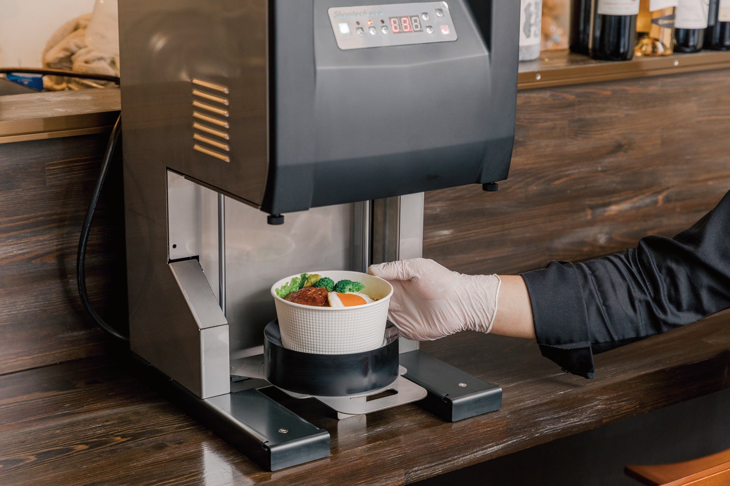 シュリンテックエコは、テイクアウト容器に簡単にフィルムが出来る機械です。光を当てフィルムの印刷部分を熱収縮(シュリンク)させることで、素早く簡単に、様々な容器にフタをすることがで出来ます。