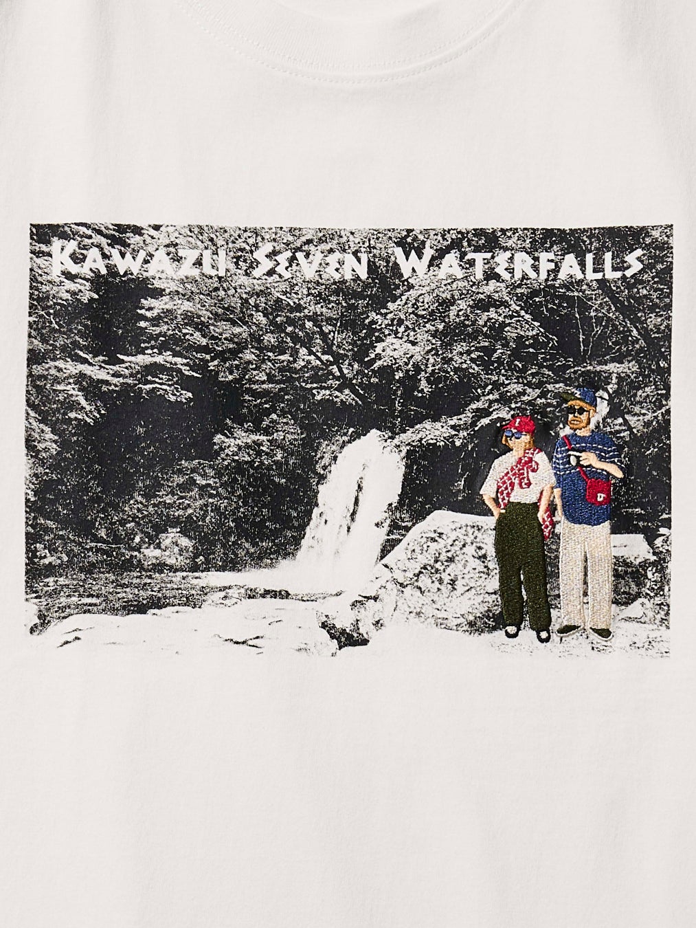 伊豆半島の渓谷を流れる河津七滝は、大小さまざまな滝が連なる絶景スポットです。川端康成の小説『伊豆の踊子』の舞台としても知られ、記念撮影スポット「初景滝」も人気です。七滝の自然をシルクスクリーンプリントでリアルに表現し、Mojashカップルが滝を訪れた様子を刺繍で表現しました。