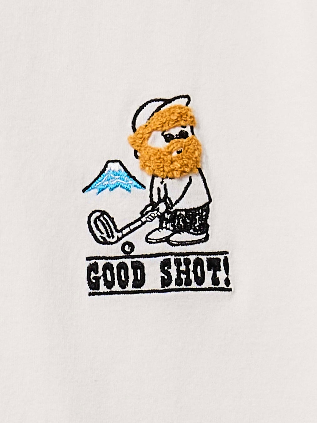 伊豆は観光リゾート地として多くのゴルファーに愛されてきた地域です。富士山や海を望む美しい景観が広がるコースが点在し、その多様な地形を活かした設計が魅力です。Mojashが雪化粧した富士山を背景に、絶景コースでゴルフを楽しむ姿をユーモラスに描き、伊豆ならではの魅力と遊び心を表現しました。