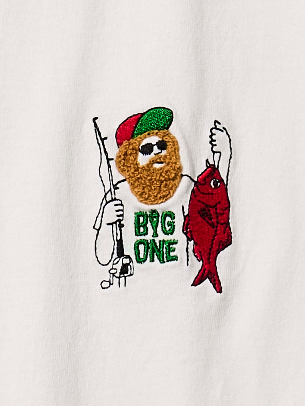 モジャッシュが伊豆の名産品であるキンメダイ釣りを楽しむ姿をプリントしたTシャツ。キンメダイ釣りは駿河湾2000メートル深いところで釣るため、パワフルなリールを搭載した特別な釣り竿にこだわりました。キンメダイの大きい目、ひれの形など忠実に表現しました。キンメダイの旬は冬と初夏の2回ありますが、初夏のキンメダイを描いています。お刺身としていただくのが最適です。