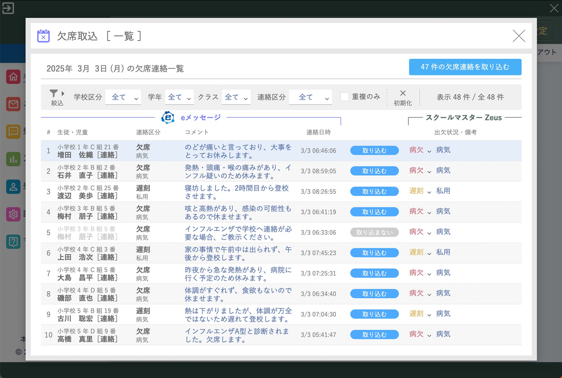 シングルサインオン連携により『eメッセージ』の一斉配信、確認を、スクールマスターZeusの画面内で操作、確認することができます。また、通常の一斉配信だけでなく「出欠連絡の確認」や「校務システムへの情報取り込み」「家庭調査票の案内・確認」をかんたんなボタン操作のみで行うことが可能です。