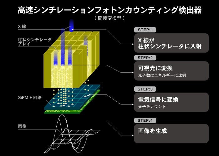 フォトンカウンティングX線検出器は最近大きな関心を集めています。ピクセル化されたエネルギー弁別検出器は、X線フォトンカウンティングコンピュータ断層撮影(PCCT)システムに必要であり、非常に興味深いものです。CdTeやCdZnTeなどの直接変換型フォトンカウンティングX線検出器は製品化に成功しており、臨床PCCTスキャナーで使用されています。一方、光センサーと結合した間接変換型高速シンチレーションフォトンカウンティングX線検出器の可能性が模索されていますが、現実的なファインピッチ(数百マイクロメートルピクセル)のシンチレータアレイ、SiPMはまだ実証されていません。そこで当社では、東北大学ならびに株式会社C&Aとシンチレータアレイを、FBK社(イタリア、トレント)とSiPMを、各々共同開発し、X線検出器モジュールを製作しました。このX線検出器モジュールの実証実験は、東京大学と共同で実施し、その結果として、X線PCCTの使用に対する間接変換型フォトンカウンティングX線検出器の大きな実現可能性を示すことができました。