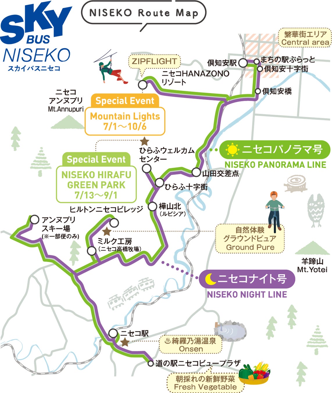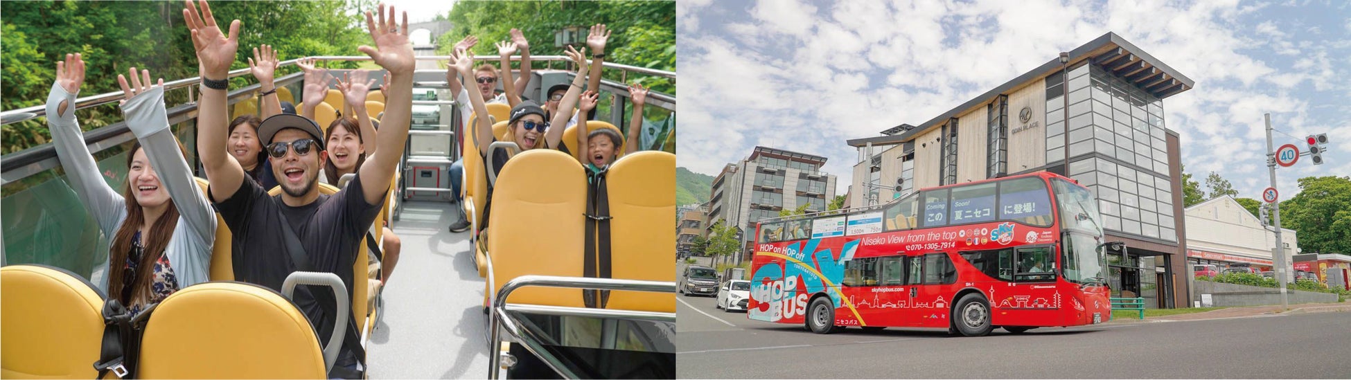 スカイバスニセコは、オープントップバスにて運行されるグリーンシーズン限定のバスサービスで、目の前に広がるニセコの景色と雄大で美しい羊蹄山を楽しみながら、NISEKO HIRAFU GREEN PARKやHANAZONOマウンテンライツなど限定のスペシャルイベントを巡ることができ、一味違うニセコ観光を堪能できます。