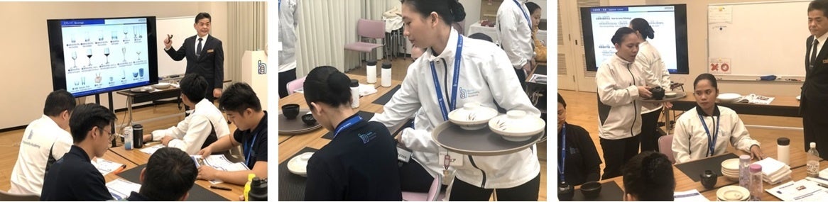 本アカデミーでは、日本語や日本の生活様式を学ぶだけでなく、施設内に設けたホテルの客室を想定したモックアップルームでの客室清掃のほか、飲食サービスの業務など宿泊施設での就業に必要なレストラン研修が可能です。ホテル業のそれぞれの分野を極めたプロフェッショナルな講師陣からホテルにまつわるさまざまな技術指導が受けられるのが特徴です。