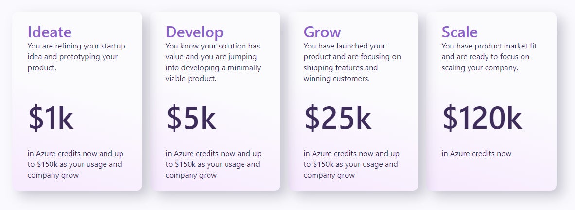 本プログラムにより、Azure 無償枠 150,000ドル (約 2,130 万円) をはじめ、Microsoft 365、OpenAI service等、最大350,000ドル(約4,970万円)分の開発環境・各種ツールを無償で提供いただきます。また、マイクロソフト社のイノベーションに対する世界レベルの知見をもとに、技術面のメンタリングや顧客開拓等のサポートを受けることが可能になります。
