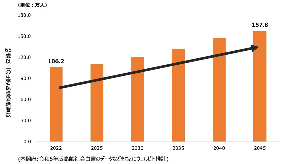 それによると、2022年時点で106.2万人の65歳以上の生活保護受給者数は、約20年後の2045年には157.8万人と約1.5倍に増加する見込みとなりました。