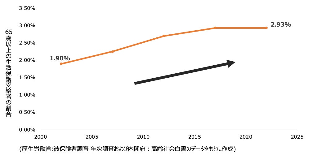 そこでも紹介した通り、65歳以上の高齢者世帯で生活保護受給の増加が著しく、2012年の63.6万世帯が2022年には91.3万世帯と過去10年で1.4倍に増加しています。また受給世帯全体に占める割合も55.8%が高齢者世帯(2022年時点)と、実に半分以上が高齢者世帯というのが現状です。65歳以上人口に占める生活保護受給者の割合についても、2000年代前半の1.9%から2022年には2.93%と1%以上高まっており(図1)、増え続ける高齢者の中で生活保護を受給する人の割合も高まってきているということがわかりました。