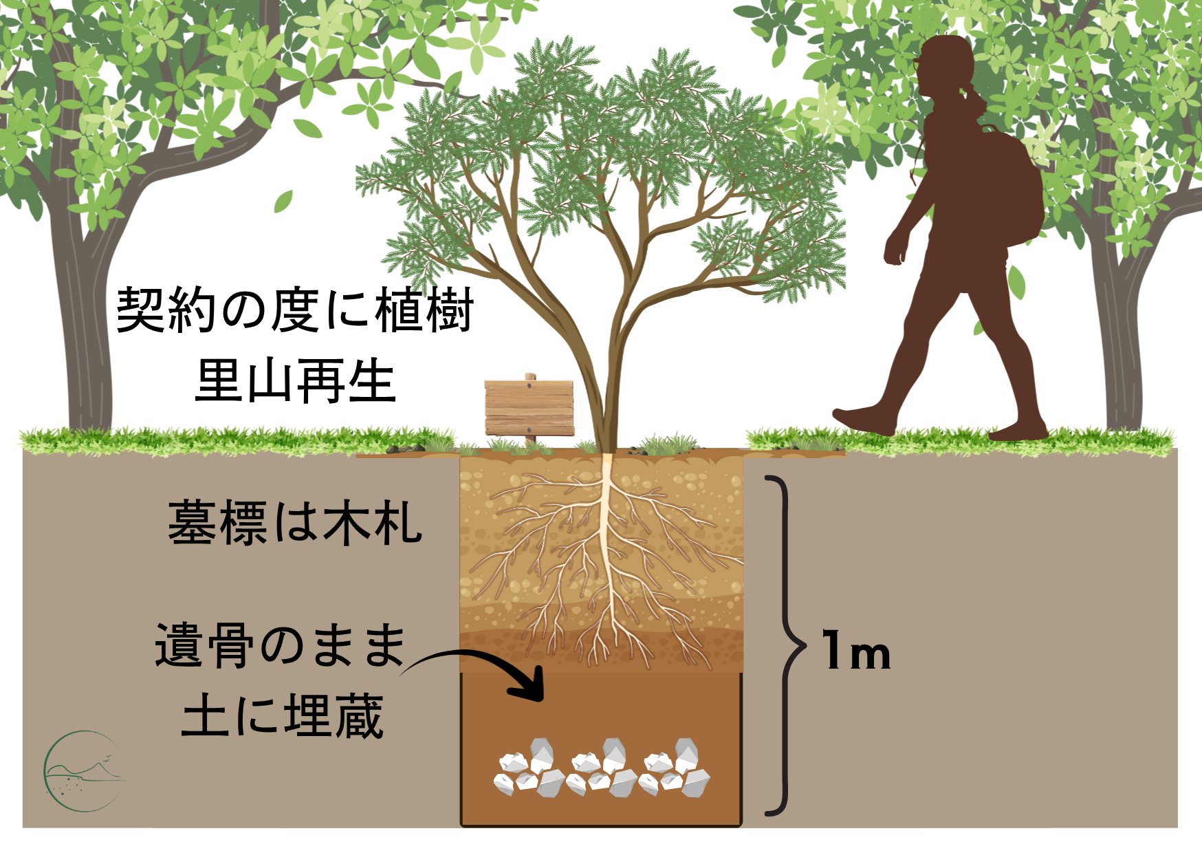 遺骨を直接土に埋蔵し、年月をかけて周囲の生態系と一体化させることで、名実ともに「土に還る」仕組みは、契約者へ安心を提供しつつ契約で発生した資金を里山ふくめた周辺の自然環境保護に活かしています。