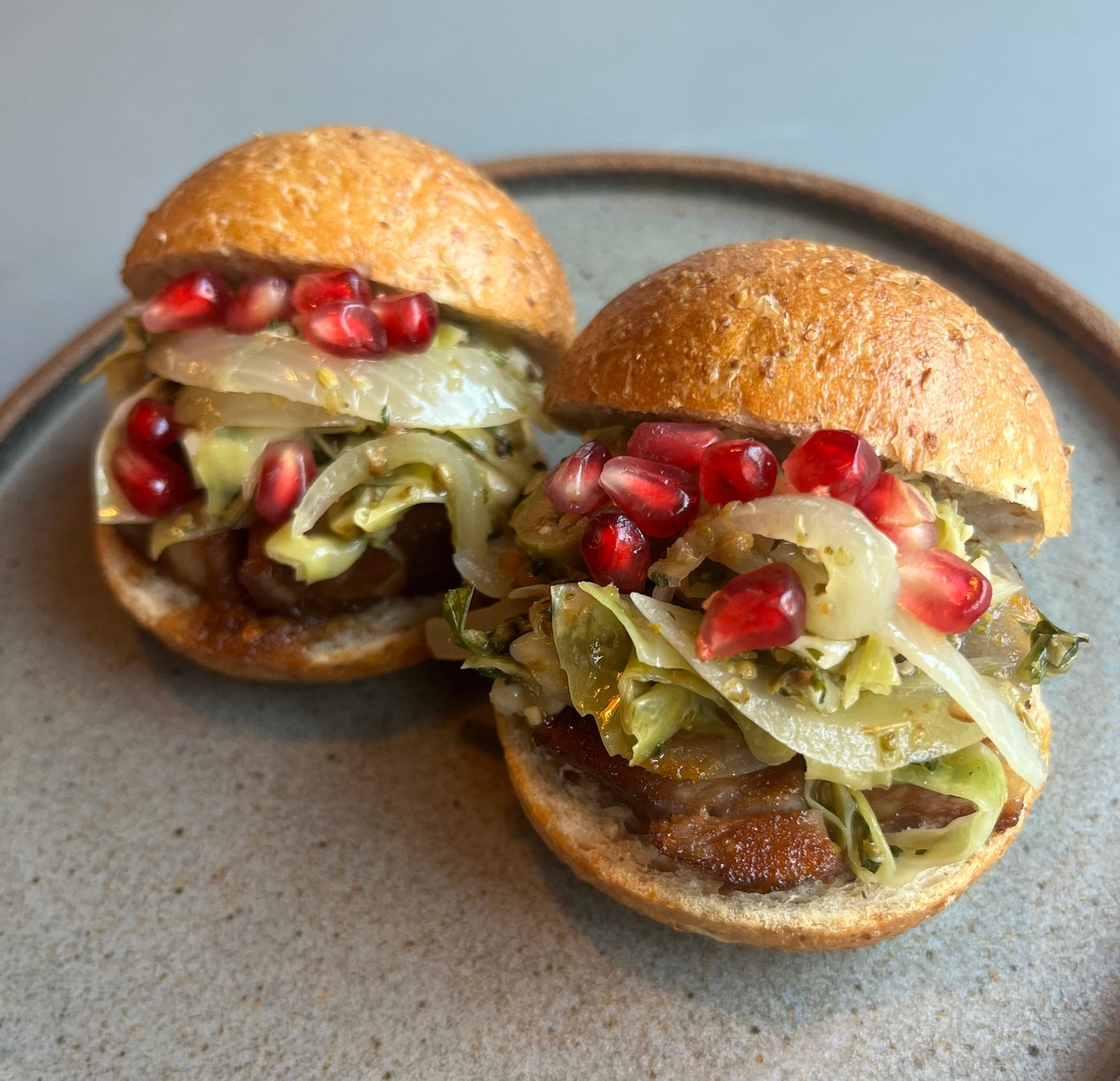 ベトナムの食べるラー油とも言われる調味料、サテトムをベースにした甘辛ソースで焼き上げた豚肉をキャベツとザクロのなますを全粒粉ミニバンズでサンドしたスペシャルミニバインミー。