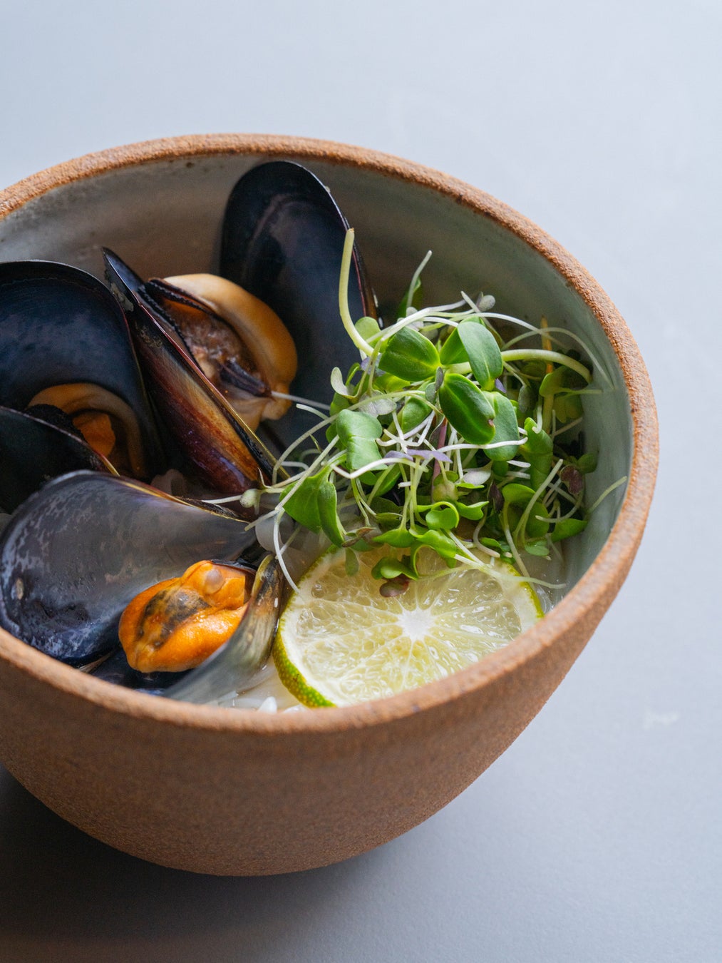 鶏ガラ、あご、香味野菜、スパイス、ハーブなどで2日間じっくり出汁を取り、深みの中にあっさり感も感じられるスープをベースに、新潟白色米のもちもちした生米粉麺を使用、ムール貝の塩気江戸前ハーブを豪快に使用したフォー。