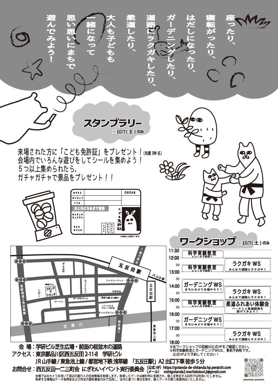 にぎわいイベント「ゴタンダデシタンダ!!」は、毎年10月初旬に行われる地域の神事である雉子神社例大祭と一体となってにぎわいを創出することを目的に、今回初めて実施する西五反田一二三町会(にぎわいイベント実行委員会)が主催する地域イベントです。本イベントは、にぎわいの創出だけでなく、地区の魅力である学研ビル公開空地の芝生広場や地区中央を東西に走る桜並木の道路などの公共空間をくつろいだり遊んだりできる空間として活用することにより、今後の地区のまちづくりを考えるきっかけとすることも目的としています。