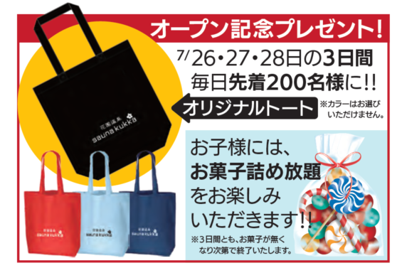 グランドオープン初日から3日間は、オープン記念トートバックプレゼントやお子様が対象のお菓子詰め放題イベントを実施中。期間中、各日先着200名様となっております。