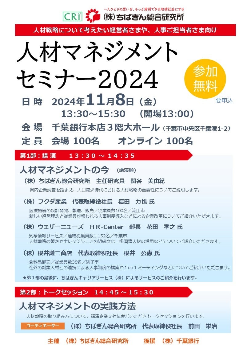 千葉銀行本店あるいはオンラインでの参加が可能です。ぜひお気軽にご参加ください(参加無料)。