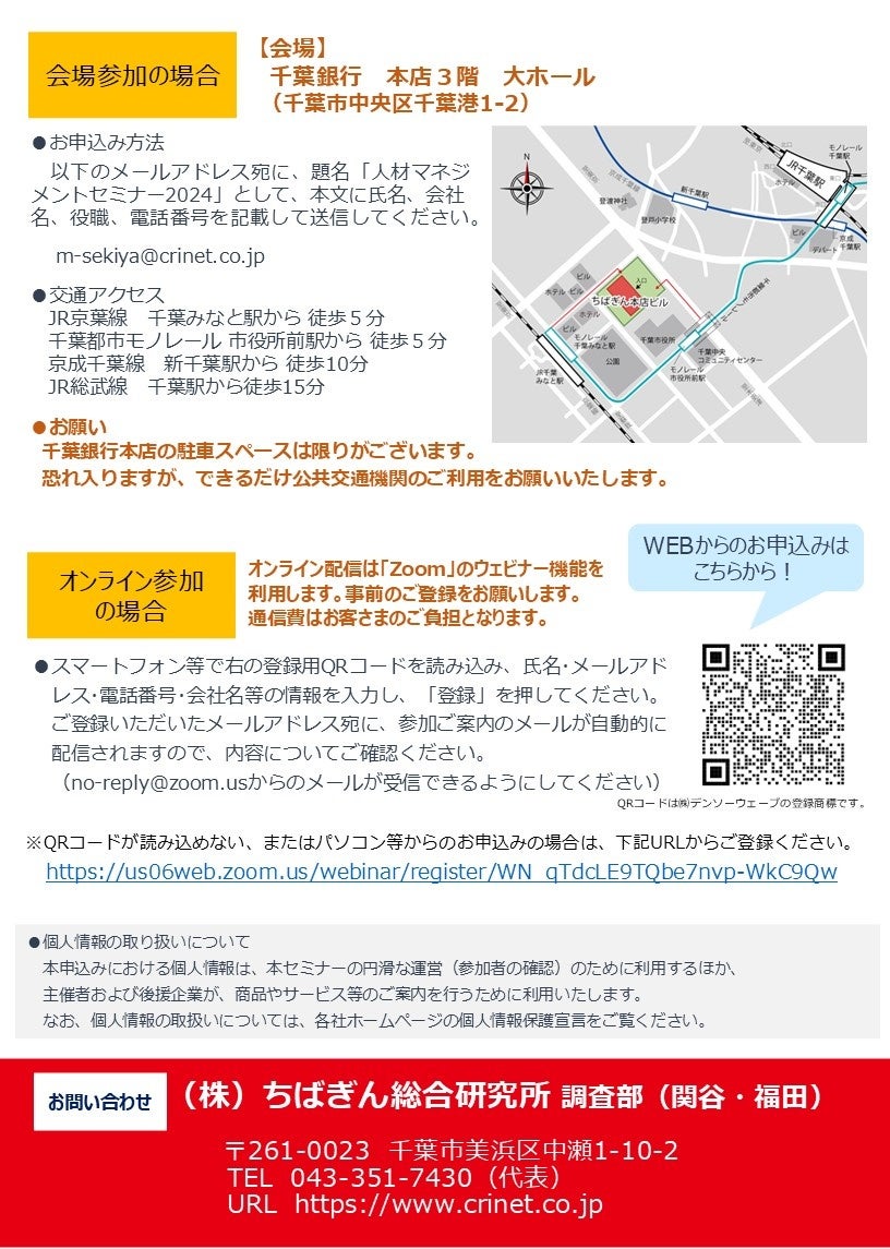 以下のメールアドレス宛に、題名「人材マネジメントセミナー2024」として、本文に氏名、会社名、役職、電話番号を記載して送信してください。
