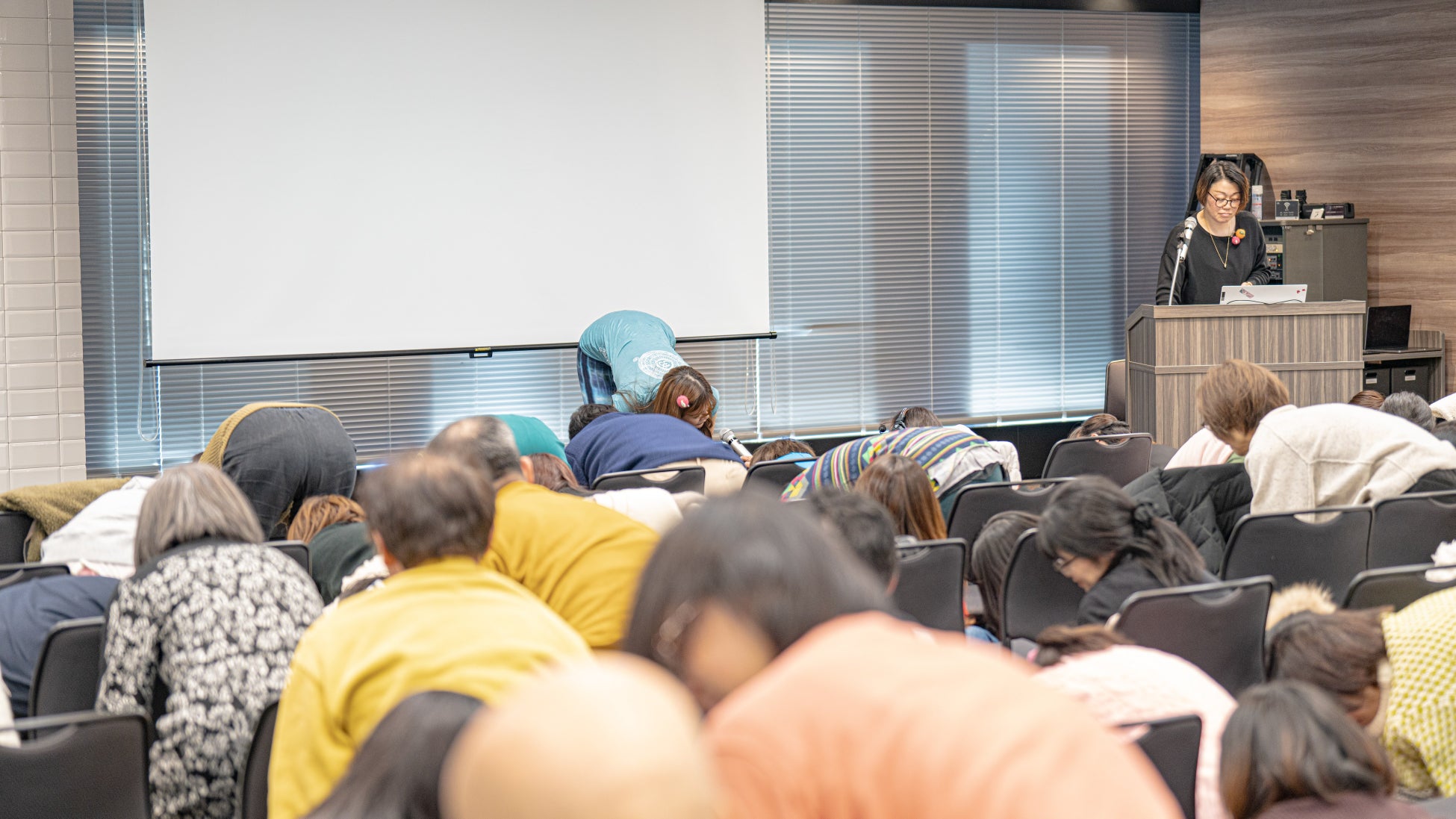 第2部では一般社団法人ALA日本セルフチューニング協会代表の神谷かのみ氏、ヨガ指導者育成講師の渡邊有優美氏が登壇し、体験型セッション「椅子ヨガで体験する、関節デトックス」を行いました。