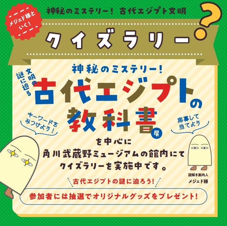 古代エジプトの神さま「メジェド様」が出すクイズに答えながら、エジプトの謎を解き明かすクイズラリーを実施します。クイズの答えから導き出されるキーワードを記載して館内のボックスにご応募いただいた方の中から、抽選でオリジナルグッズをプレゼントします。
