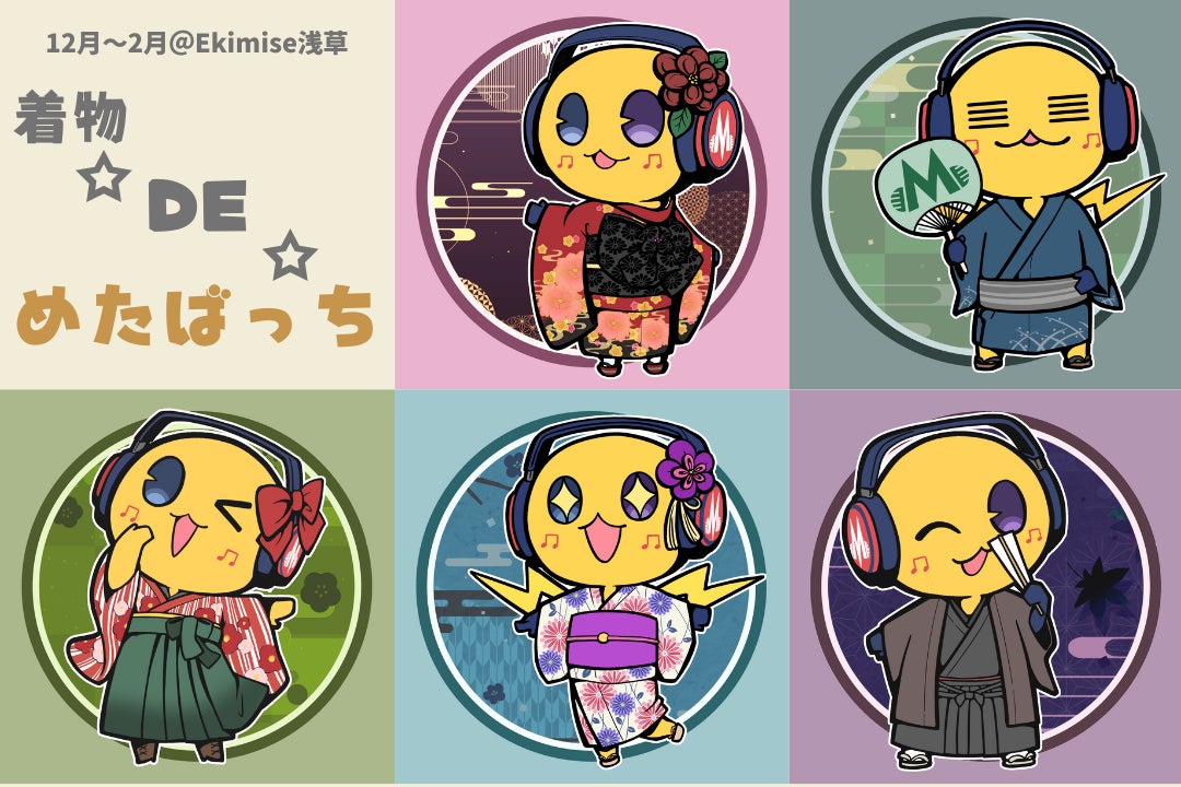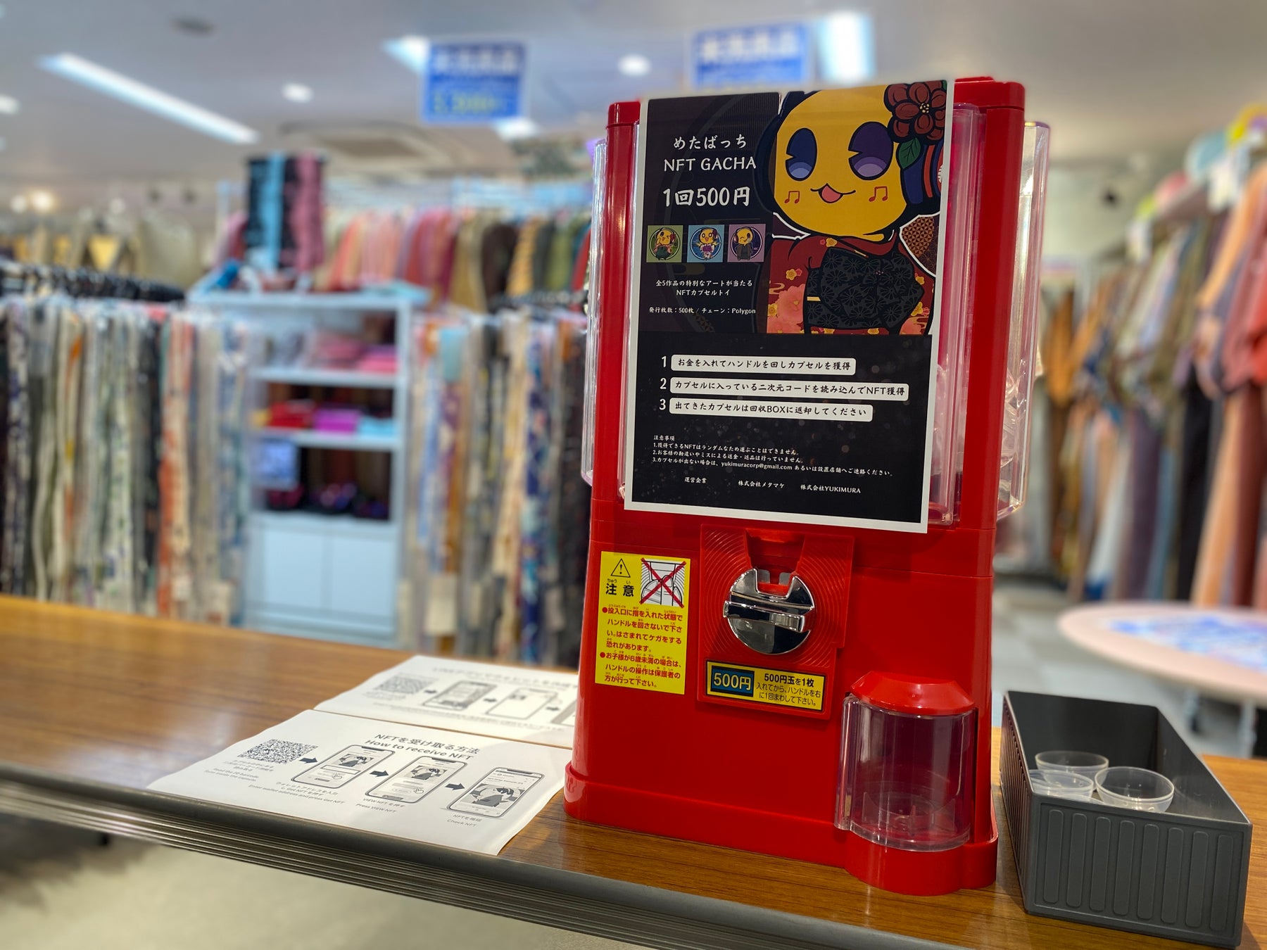 2023年12月17日から2024年2月29日の間、「浅草駅」直結の「Ekimise浅草」7階「MEGAたんす屋」目の前のガチャガチャスペースにて、限定デザインの「着物☆DE☆めたばっち」ほか様々な着物をテーマにしたデジタルアート(NFT)を購入できるガチャガチャの展示販売が行われます。