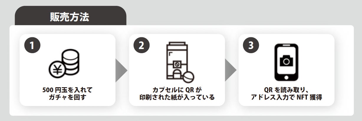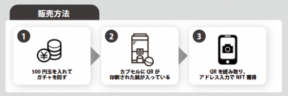 入手方法:ガチャガチャを回した後、QRコードを読み取り、ウォレットアドレスを入力することで、5種類のうちいずれかのNFTを獲得できる。