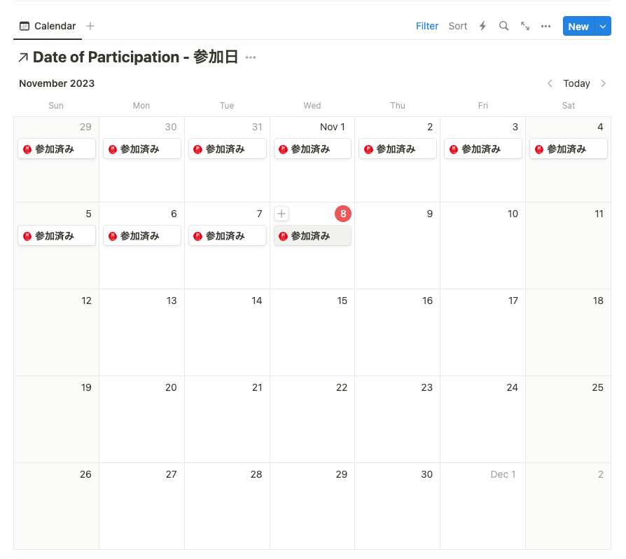 参加者さん毎にNotionページを用意しており、いつ参加したのかや何日継続して参加しているかが一目でわかります。