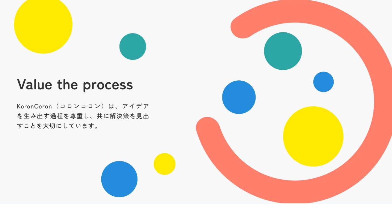 「KoronCoron」は、名前の由来である「コロンコロン」という言葉のように、ころころと小さいものから大きいものまで、外に出たり内にとどまったりする思考やアイデアを連鎖させ、アイデアを生み出す過程を大切にしています。